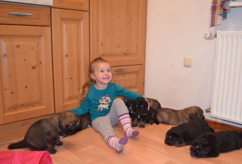 Viele verschiedene Menschen unterschiedlichsten Alters, Größe und Temperament (speziell Kinder) prägen unsere Welpen. Wir achten darauf, dass die Kleinen nur positive Erfahrungen in dieser wichtige Phase machen. Natürlich müssen die neuen Besitzer dies auch weiterführen, aber der Grundstein wird bei uns gelegt.
